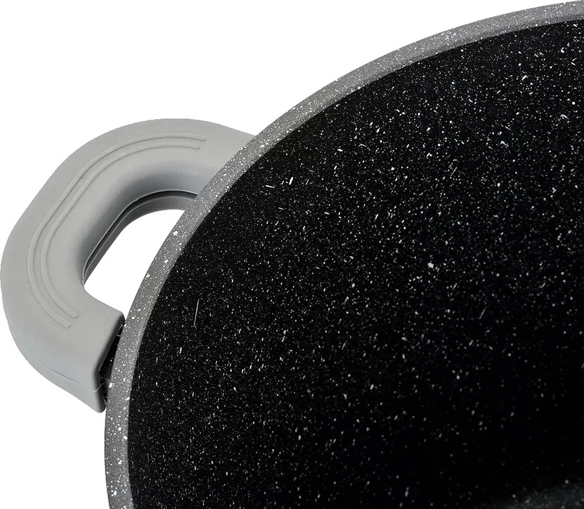 Met deze 6-delige serviesset kunt u de heerlijkste gerechten bereiden. De set bestaat uit drie potten met deksels. De potten zijn gemaakt van gegoten aluminium en hebben een 3-laagse marmeren coating. Ze kunnen worden gebruikt voor alle soorten warmtebronnen.