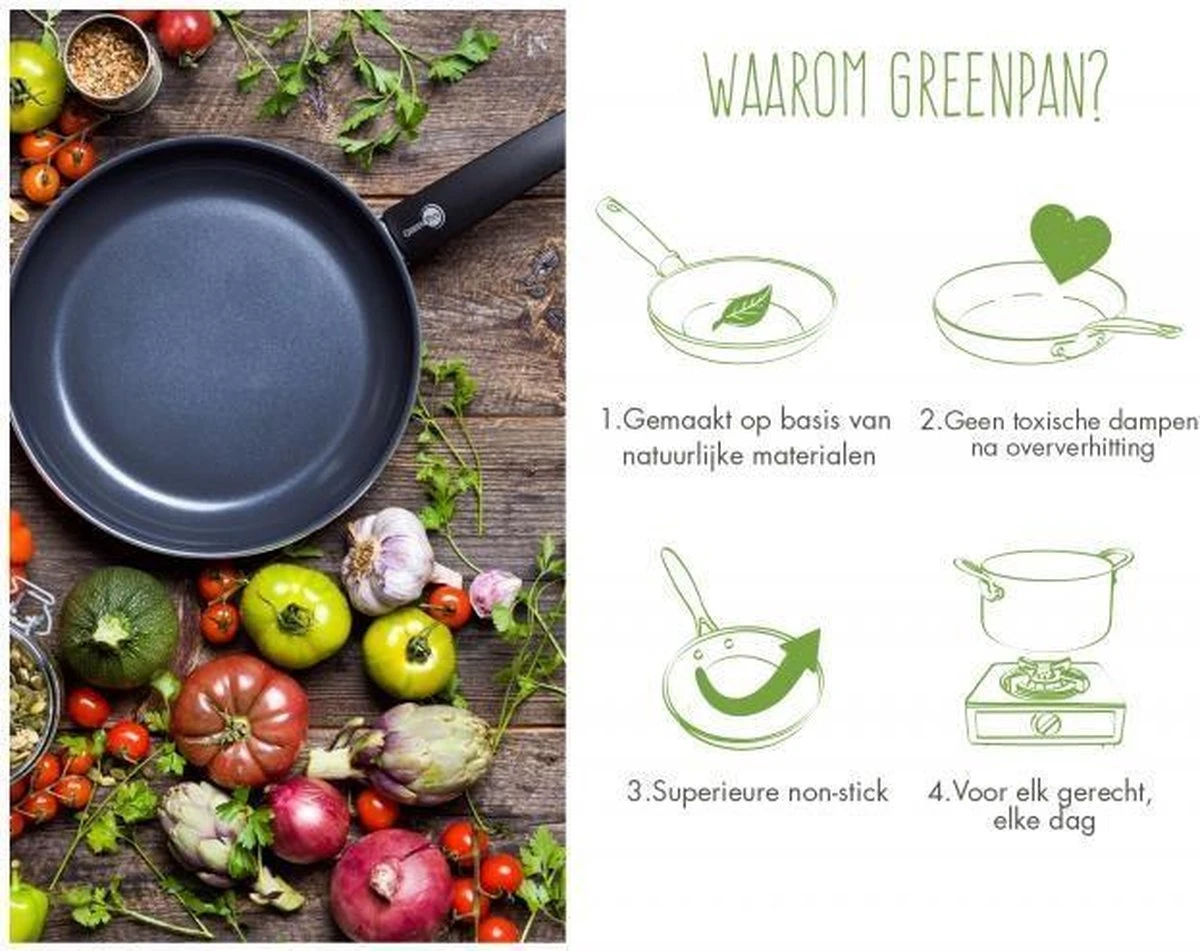 GreenPan is het merk voor iedereen die écht gezond wil koken! Alle potten en pannen hebben een gezonde keramische Thermolon™ antikleeflaag. Die is gemaakt met natuurlijke grondstoffen zoals zand. GreenPan gaat echter nog een stapje verder en gebruikt géén PFAS. Iets wat de meeste merken van antikleefpannen wél nog steeds doen. Met de keramische antikleeflaag van GreenPan ben je dus zeker dat er geen toxische stoffen kunnen vrijkomen, zelfs als je graag kookt op hoge temperaturen.