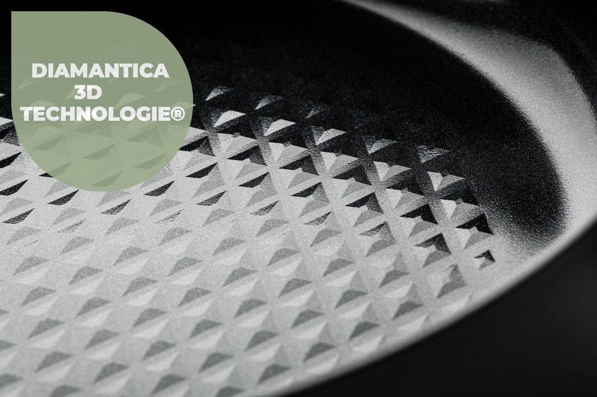 Deze luxe hapjespan 30 cm met een door Ergonomen geteste Ergo Greep ligt ideaal in de hand en je hoeft niet bang te zijn dat de handgreep te warm wordt. Met een hoogwaardige deksel van gehard glas en de Diamantica 3D technologie bereik je eenvoudig het perfecte resultaat voor een heerlijke maaltijd.